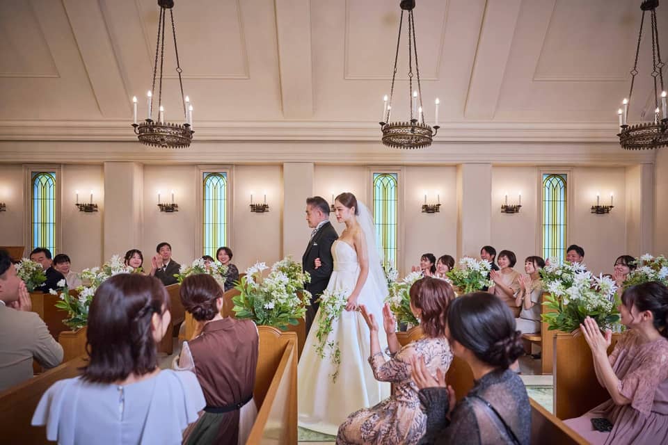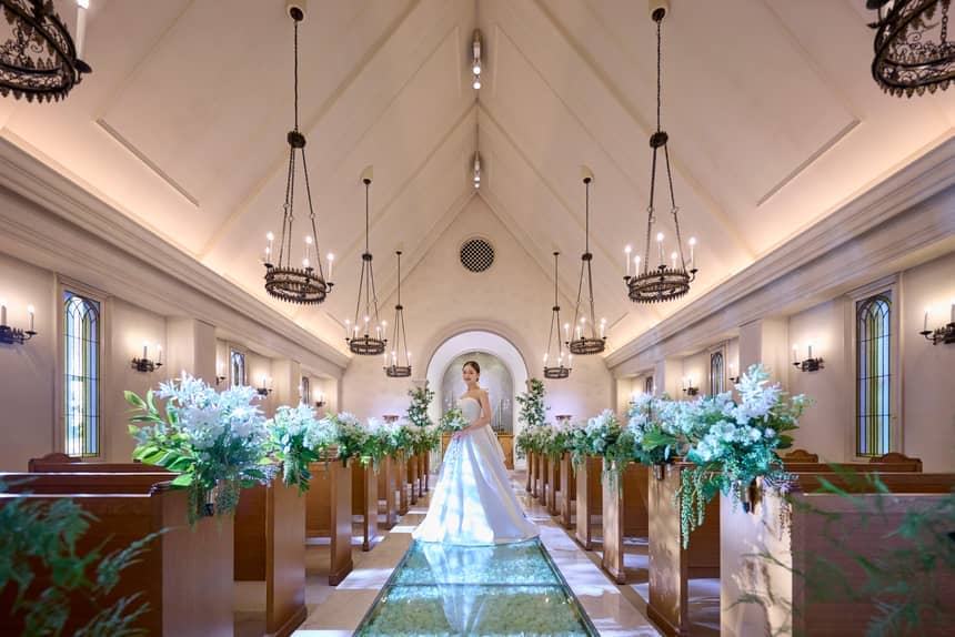 「花嫁姿が最も美しく見えるように」そんな想いが込められたチャペル。バージンロードは白薔薇で作られ、揺らめく光と色彩のコントラストが優雅に映える空間に。